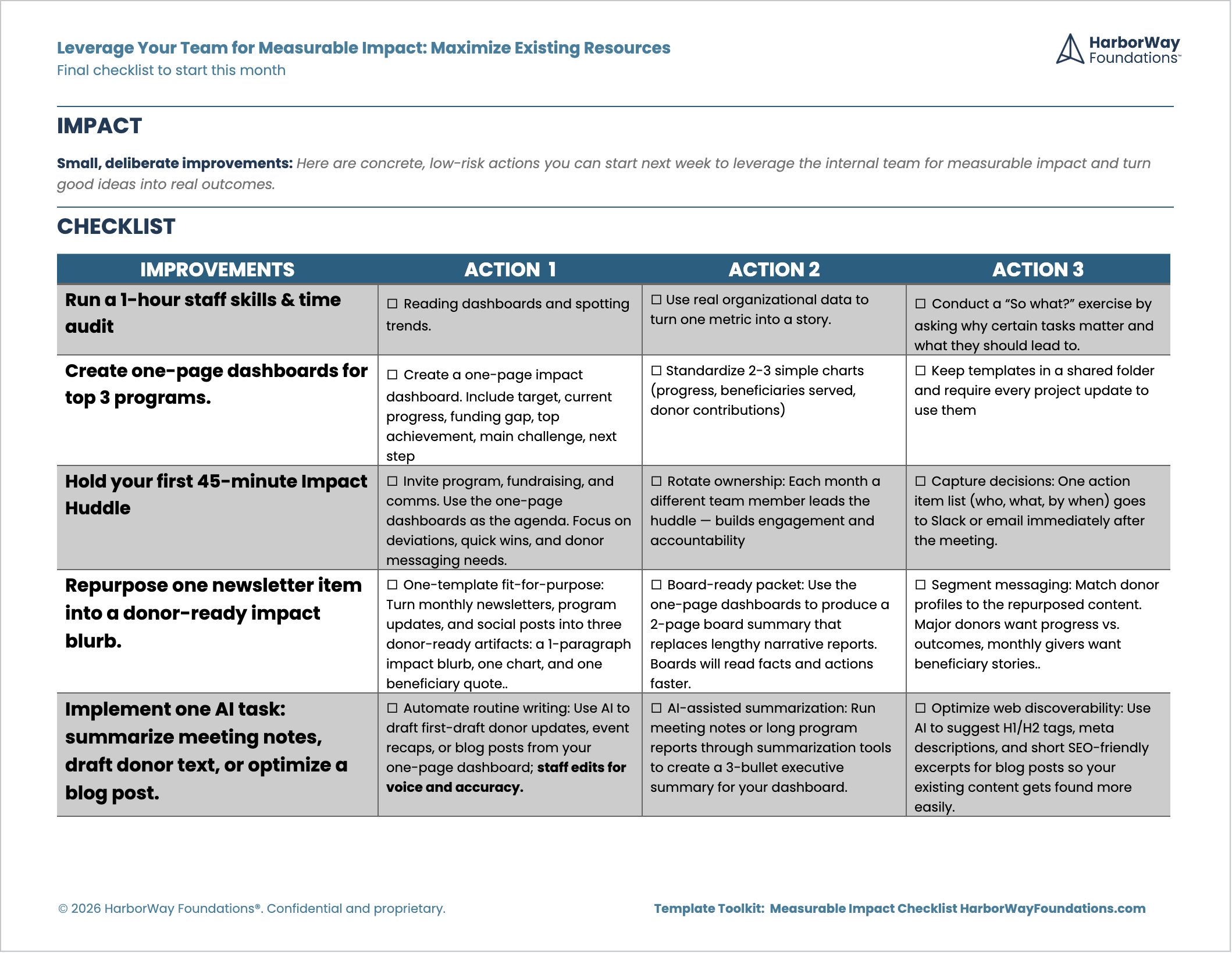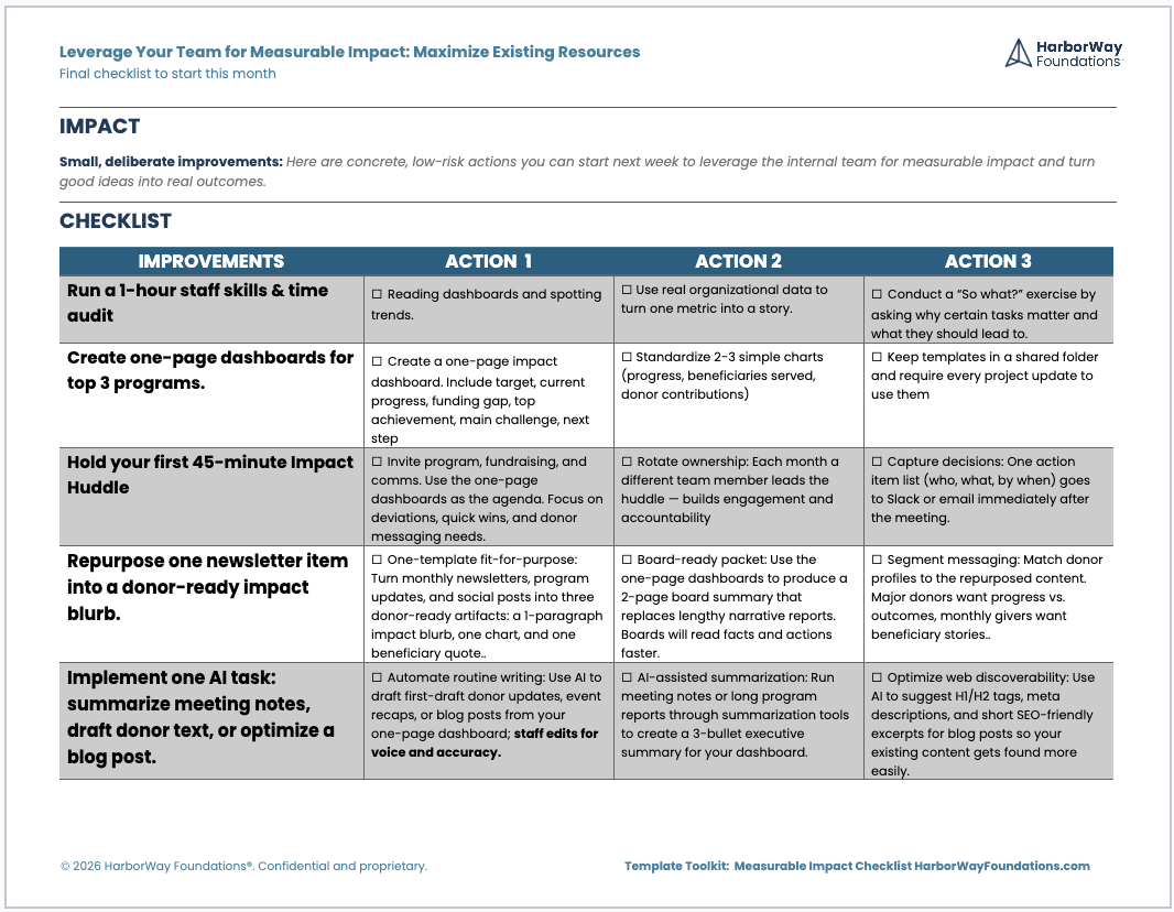 If you’d like an outside perspective on where platforms, processes, or people can create the most leverage, HarborWay Foundations works with mission-driven teams to find those opportunities.